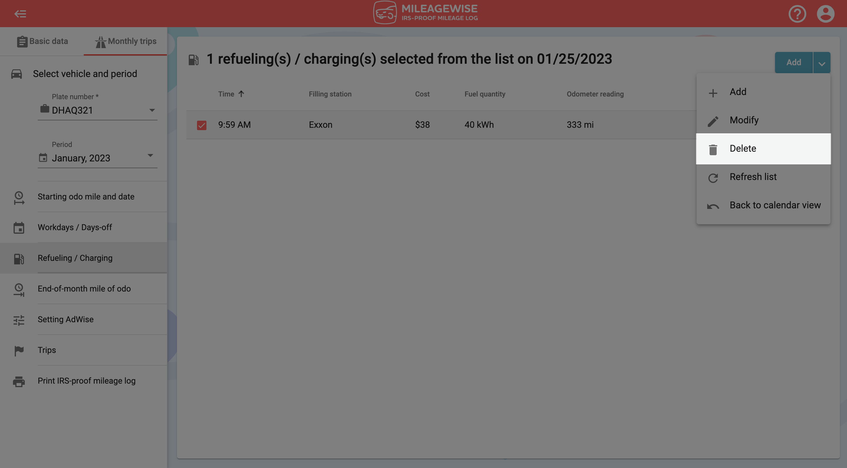 In the calendar view, double-click the day where you want to change a refueling / charging. Or right-click and select Delete from the drop-down menu.