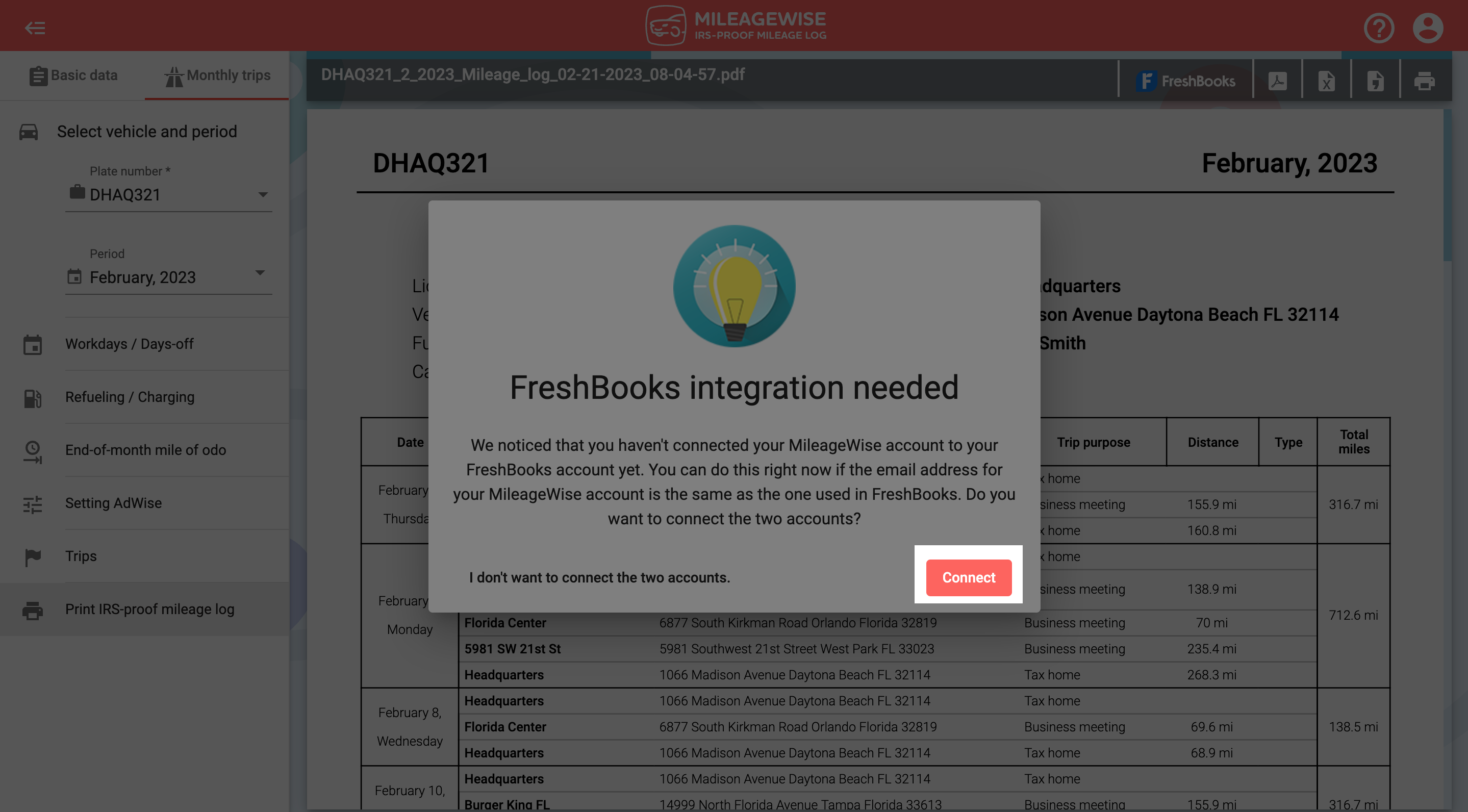 The Freshbooks email address must be the same as the MileageWise email address. There are two ways to integrate the accounts; from the FreshBooks website and from within the MileageWise dashboard.